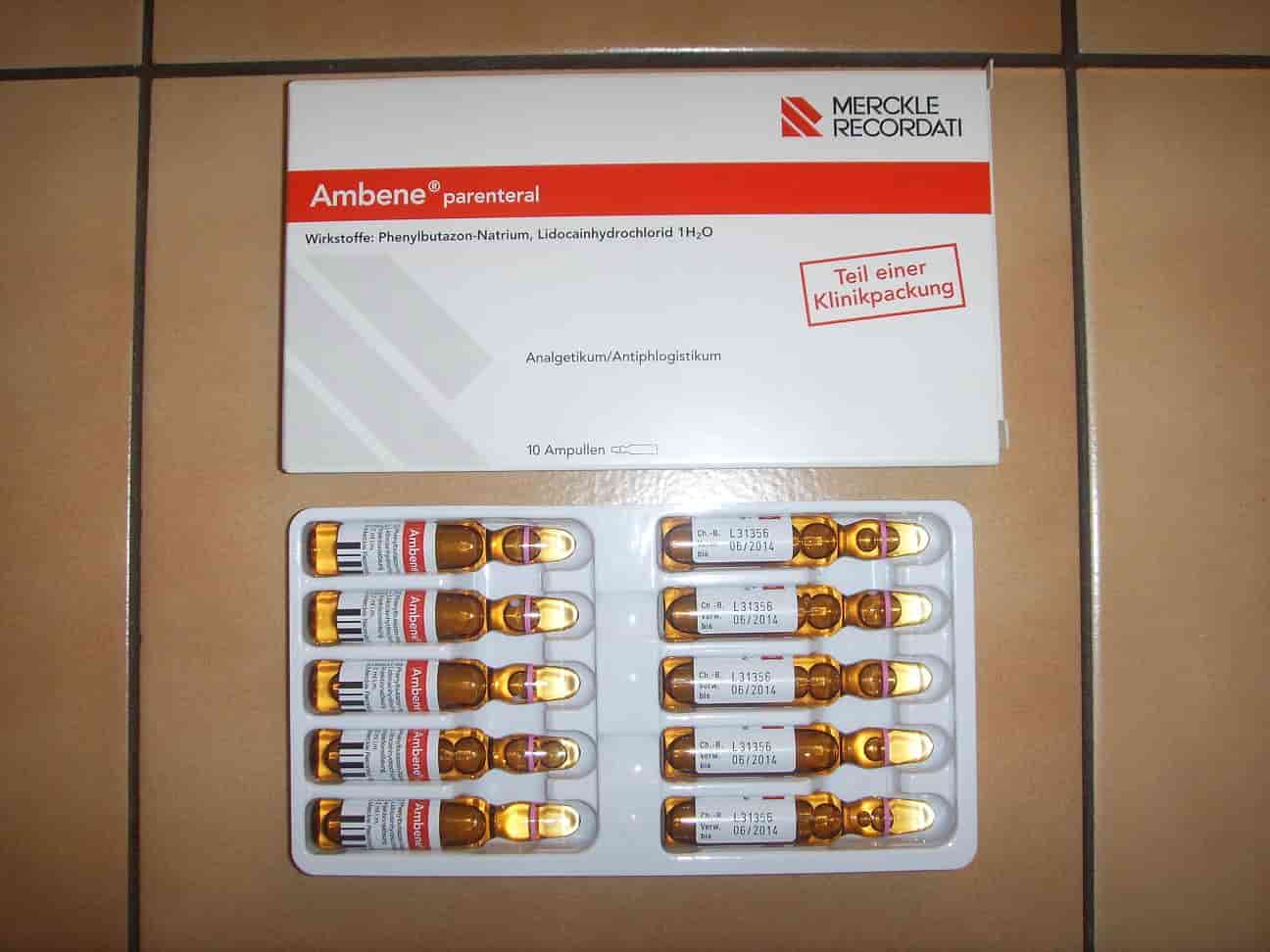 С 2010 года немецкое фармацевтическое предприятие Merckle Recordati выпускает Амбене таблетки по 20 и 50 шт. в картонной пачке. Таблетки содержат активное вещество – натрия фенилбутазон, 200 мг. Являются удобной в применении альтернативой технически сложным и часто болезненным внутримышечным инъекциям. Таблетки выписывают в тех же случаях, что и уколы, но многие врачи считают Амбене в виде таблеток малоэффективной формой терапии. Их принимают внутрь, запивая большим количеством воды, придерживаясь такой схемы: