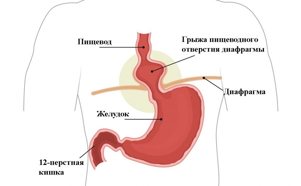 Пищевод, по которому все съеденное и выпитое отправляется в желудок, проходит через отверстие в диафрагме – мышце, отделяющей грудную полость от брюшной. Иногда она становится слишком эластичной, ее мышцы растягиваются, и небольшие части обоих органов перемещаются вверх, превращаясь в грыжу.