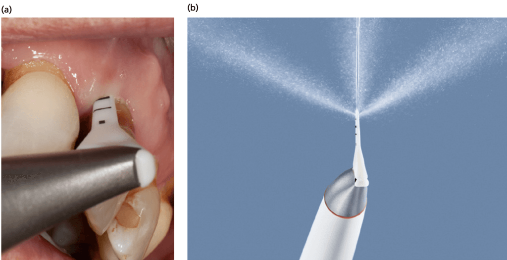 (а) Специально разработанная поддесневая насадка, применяемая для обработки пародонтальных карманов путем полировки глициновым порошком с воздушным распылением. (b) Боковое направление струи порошок/воздух, в то время как струя воды направлена апикально