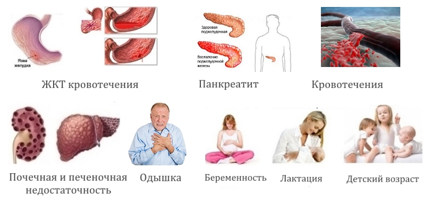 Абсолютные противопоказания: гиповолемия, «аспириновая» триада (сочетание астмы бронхиальной, непереносимости АСК и препаратов пиразолонового ряда, рецидивирующего полипоза носа и пазух околоносовых), обострение эрозивно-язвенных поражений ЖКТ, кровотечения, повышенный риск развития кровотечений, гипокоагуляция (включая гемофилию), недостаточность печеночная, детский возраст до 16-ти, почечная недостаточность тяжелая, период лактации, период родов.