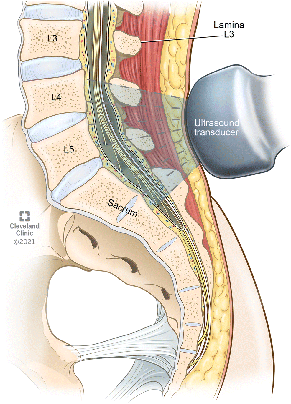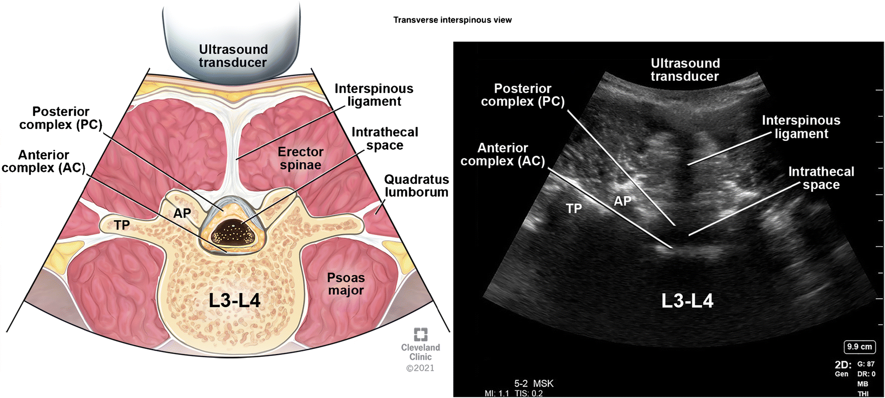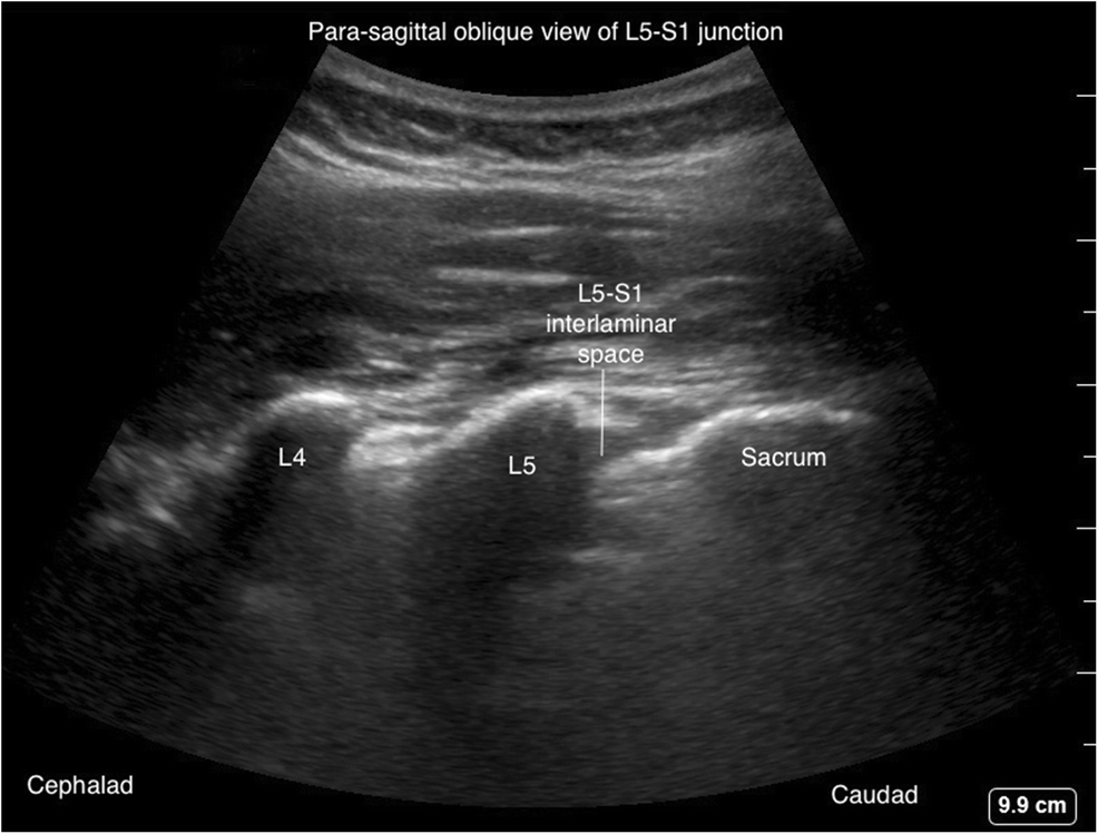 Угол датчика, необходимый для визуализации заднего и переднего комплексов в этой проекции, облегчает угол падения для введения иглы для успешного нейроаксиального размещения.
