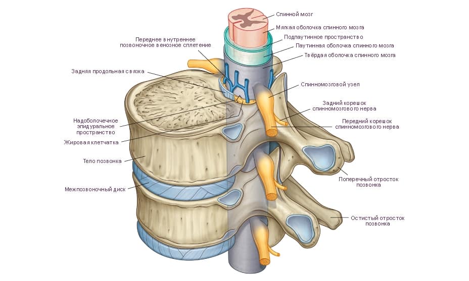 Для обеспечения гибкости позвоночного столба в его структуре присутствуют хрящевые межпозвоночные диски. Они играют роль амортизаторов и защищают корешковые нервы от компрессии. Внутри позвоночного канала располагается дуральный мешок – образование из плотной соединительной ткани, которое не пропускает жидкость и отвечает за сохранность расположенного внутри спинного мозга. Эта часть центральной нервной системы внутри дурального мешка отделена от его стенок специальной спинномозговой жидкостью. В ней растворены питательные вещества и кислород. Таким образом обеспечивается диффузное питание спинного мозга.