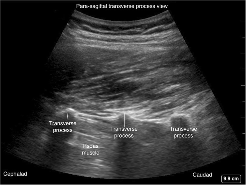 Ультразвуковой датчик располагают в парасагиттальной плоскости на несколько сантиметров латеральнее средней линии, как показано на рис. 4, положение датчика А и рис. 6. Поверхность поперечных отростков видна в виде круглых гиперэхогенных контуров с более глубокими гипоэхогенными тенями в виде темных пятен. пальцевидные выступы, как показано на рис. 7. Это описывается как «знак трезубца». Между этими гипоэхогенными тенями видна большая поясничная мышца.