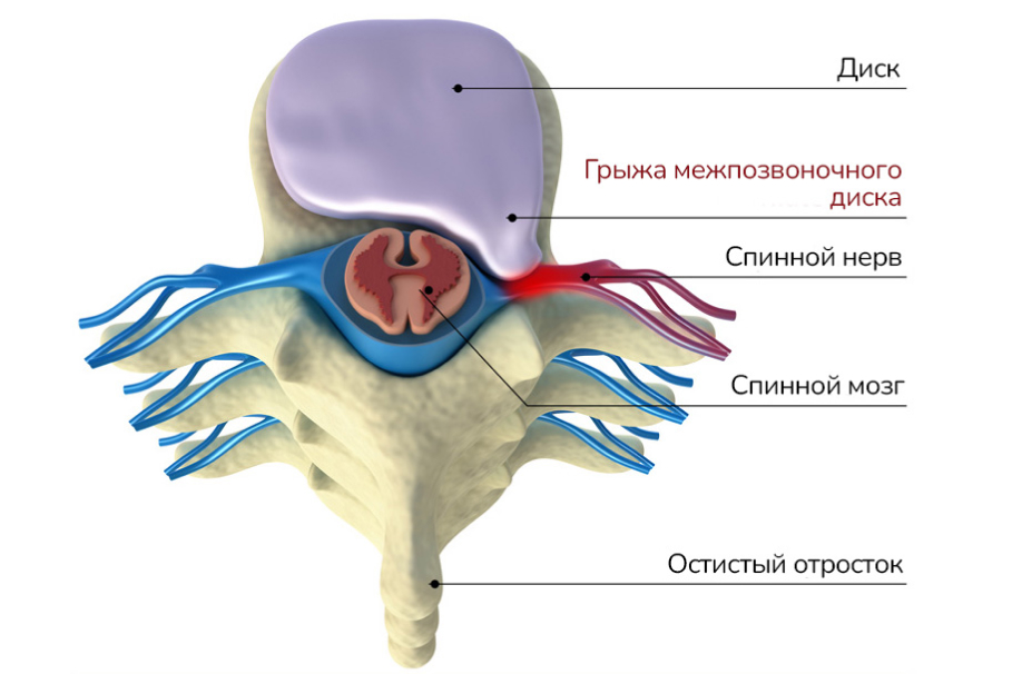 Это подразделение важно, потому что, в зависимости от типа выхода, могут наблюдаться другие симптомы: боковой выход приводит к сжатию выходящего нервного корешка, а центральный выход может привести к сжатию спинного мозга. С другой стороны, возникновение грыжи межпозвоночного диска из-за единичной травмы наблюдается редко