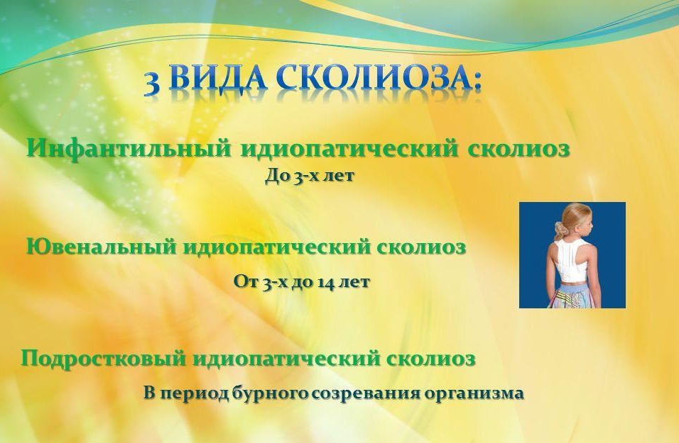 Сколиоз делят на несколько типов в зависимости от времени определения: