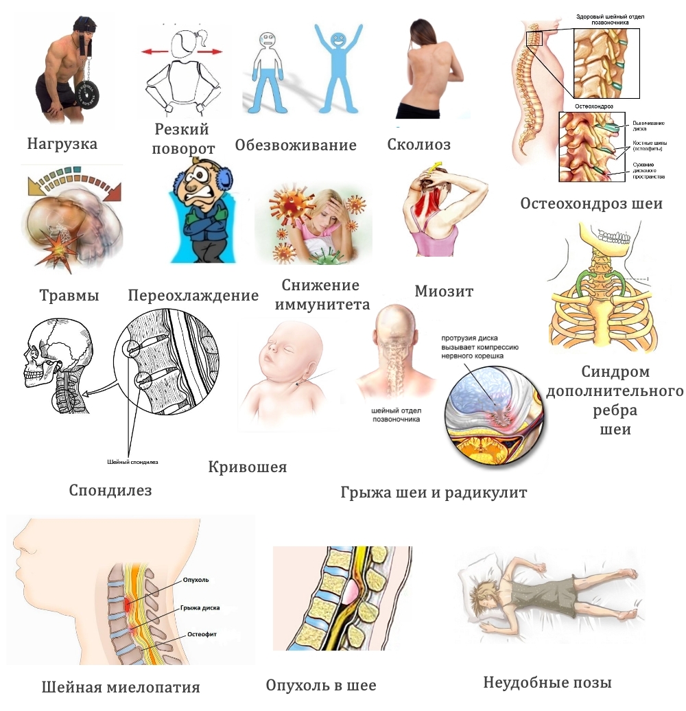 Мышечные спазмы в области шеи могут возникать по причине следующих заболеваний:
