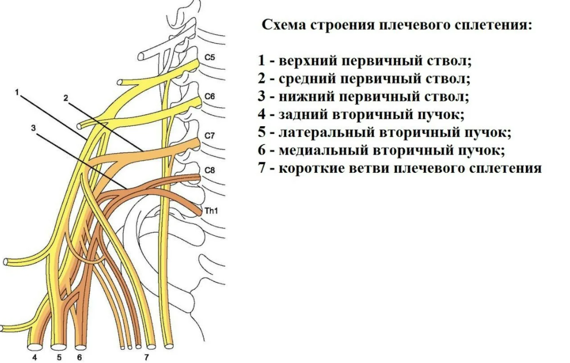 Плечевое нервное сплетение состоит из нервов, происходящих от шейных сплетений, включая лучевой, плечевой, медиальный, аксиллярный и субсапулярный нервы.