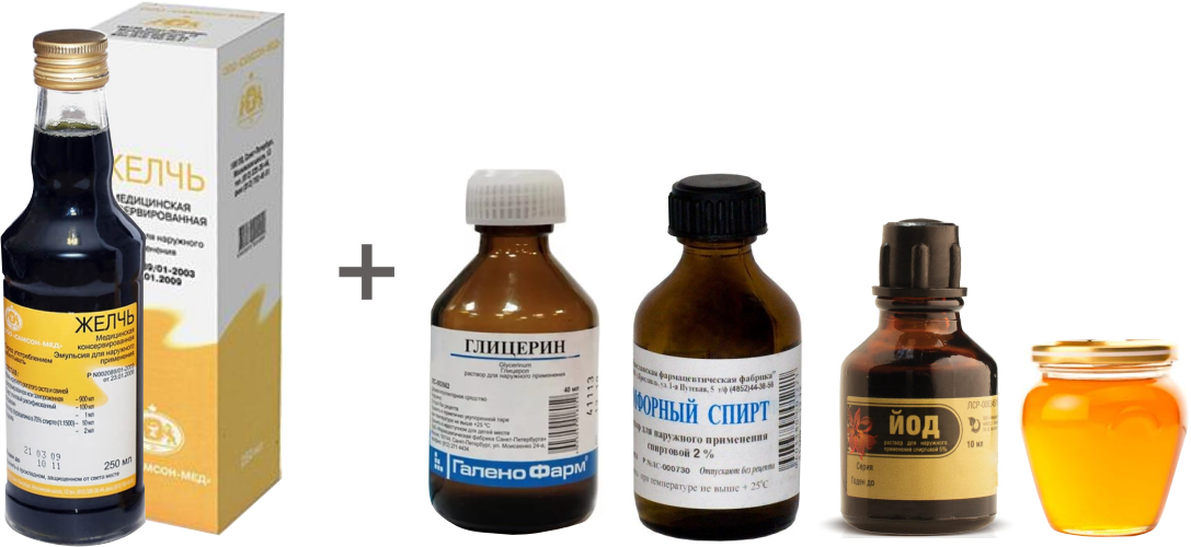 Компрессы с добавлением йода тоже популярны. На 50 г желчи требуется 20 капель йода, 30 г спирта и ложка глицерина. После перемешивания в стеклянной посуде смесь хранят 7-10 дней в холодном темном месте.