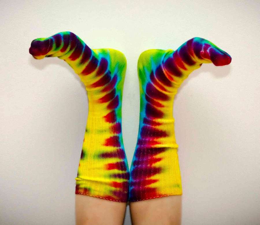 Необычные оригинальные узоры появляются на носках тай-дай в результате их скручивания и завязывания особым образом.