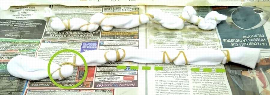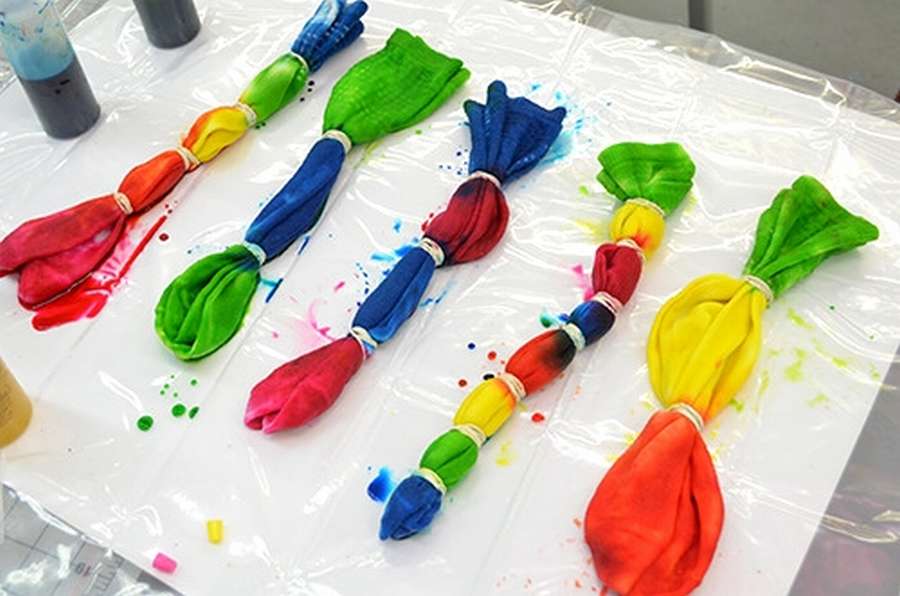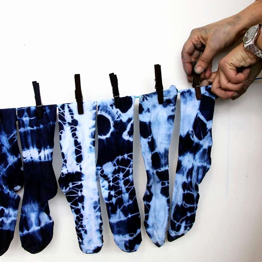 Процесс обработки белых хлопчатобумажных носков для придания им окраски стиля тай-дай. Связав носки резинками для получения интересных узоров, изделия окунают в разведенную краску и выдерживают до 30 минут. Потом их следует вытащить оттуда и сушить при температуре 21 градус. (В летний теплый день лучше на улице). Все операции проделываются на столе, застеленном газетами, чтобы не запачкать.