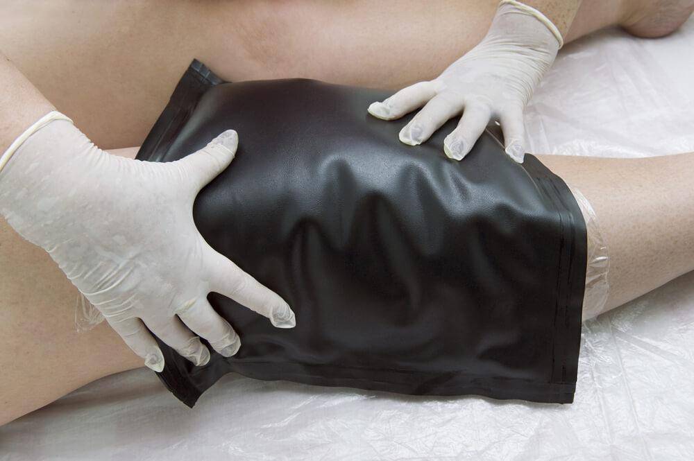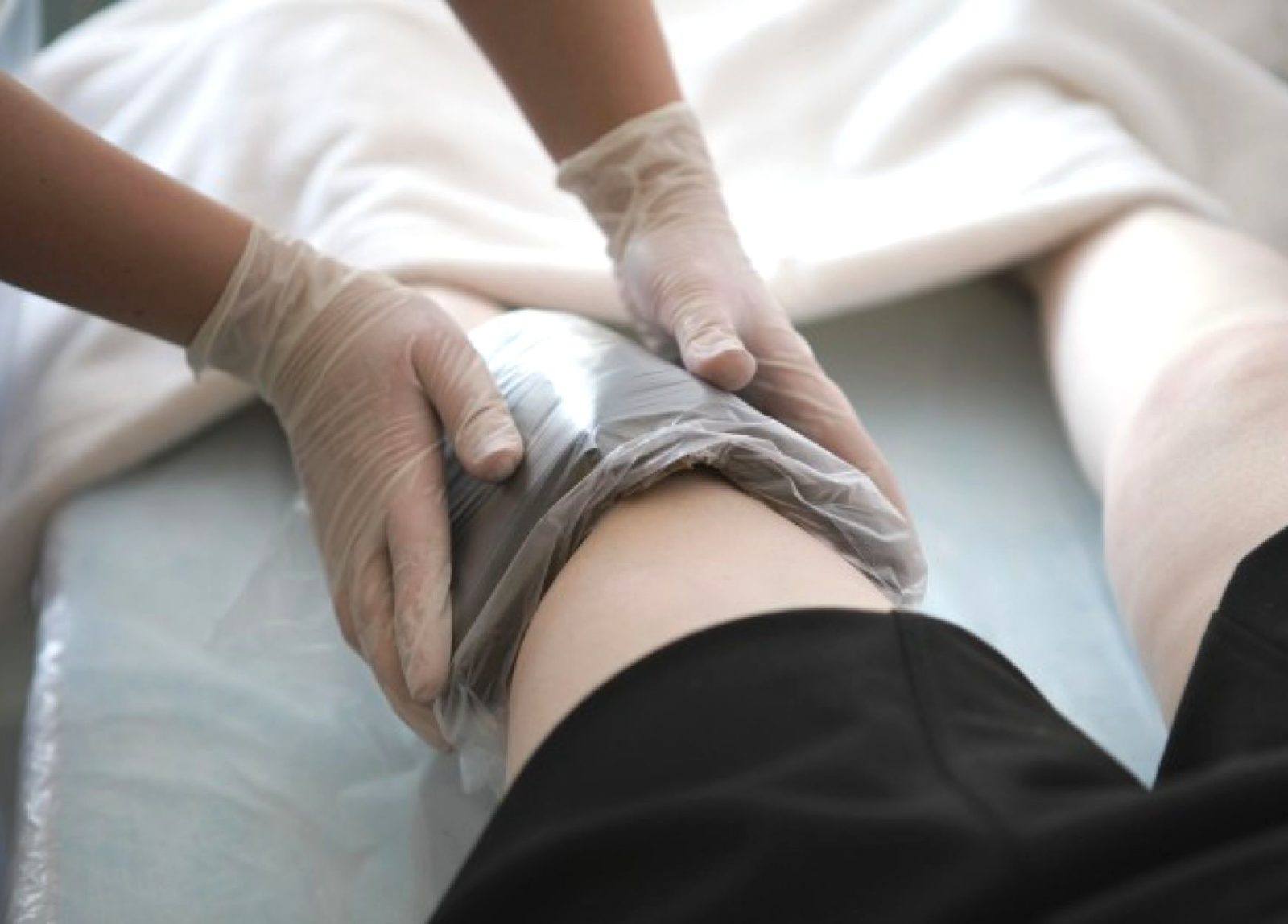 При необходимости обработки небольших участков в области колена, нередко применяются многослойные марлевые салфетки, пропитанные расплавленным озокеритом. Для проведения процедуры они вымачиваются в расплавленном горном воске. Нужно остудить состав до температуры 50°C и наложить на пораженную область.