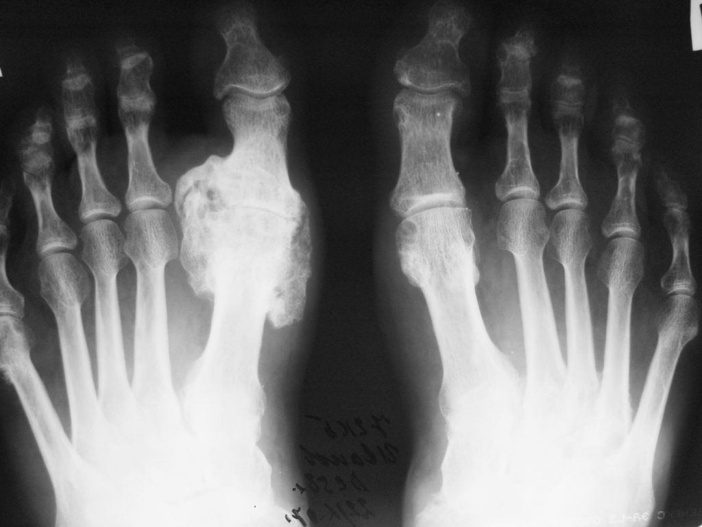 Рентгеновские снимки помогают выяснить степень разрушения костных структур при подагре.
