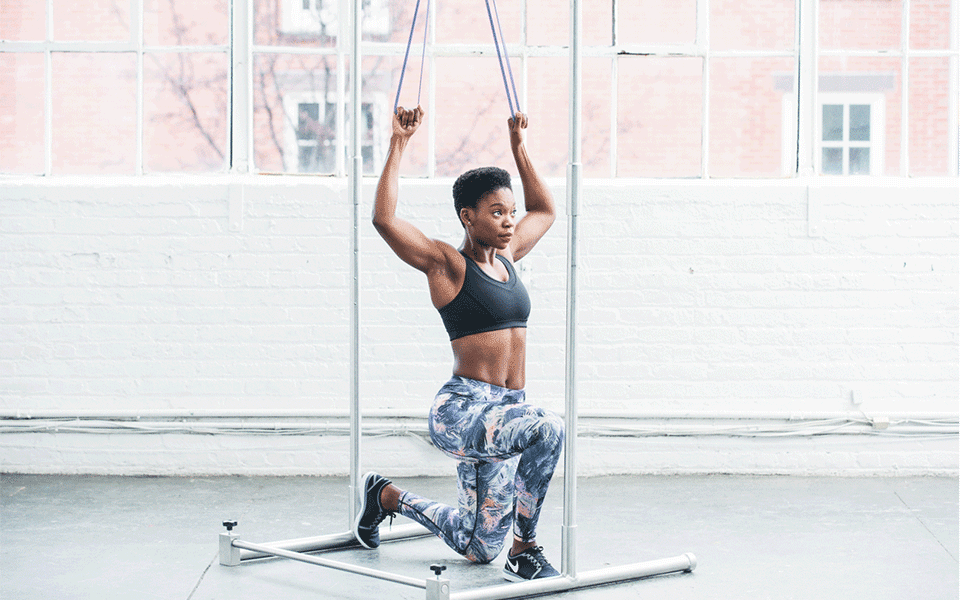 Закрепите два жгута эспандера к шведской стенке параллельно друг другу. Возьмитесь за рукоятки и притяните руки к груди. Приседайте в стойке «сумо».
