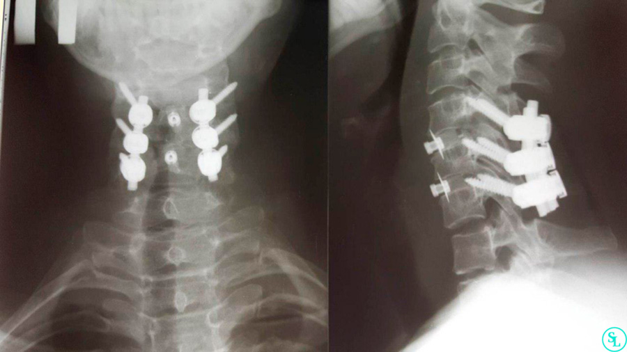 Стеноз шейного отдела позвоночника, вызывающий сужение позвоночного канала, может стать причиной серьезных осложнений, вплоть до летального исхода. В данном случае необходима операция корпорэктомия С4 и С5 позвонков. Мы проводим такие операции микрохирургическим методом, без применения аутокости в качестве трансплантата. Замена позвонков осуществляется титановым имплантатом Хармса (Harms Cage) с заполнением губчатой костью из резицированных элементов позвоночника. Стабилизация позвоночного сегмента осуществляется вентральной пластиной системы Медтроник Атлантис и фиксирующих винтов.