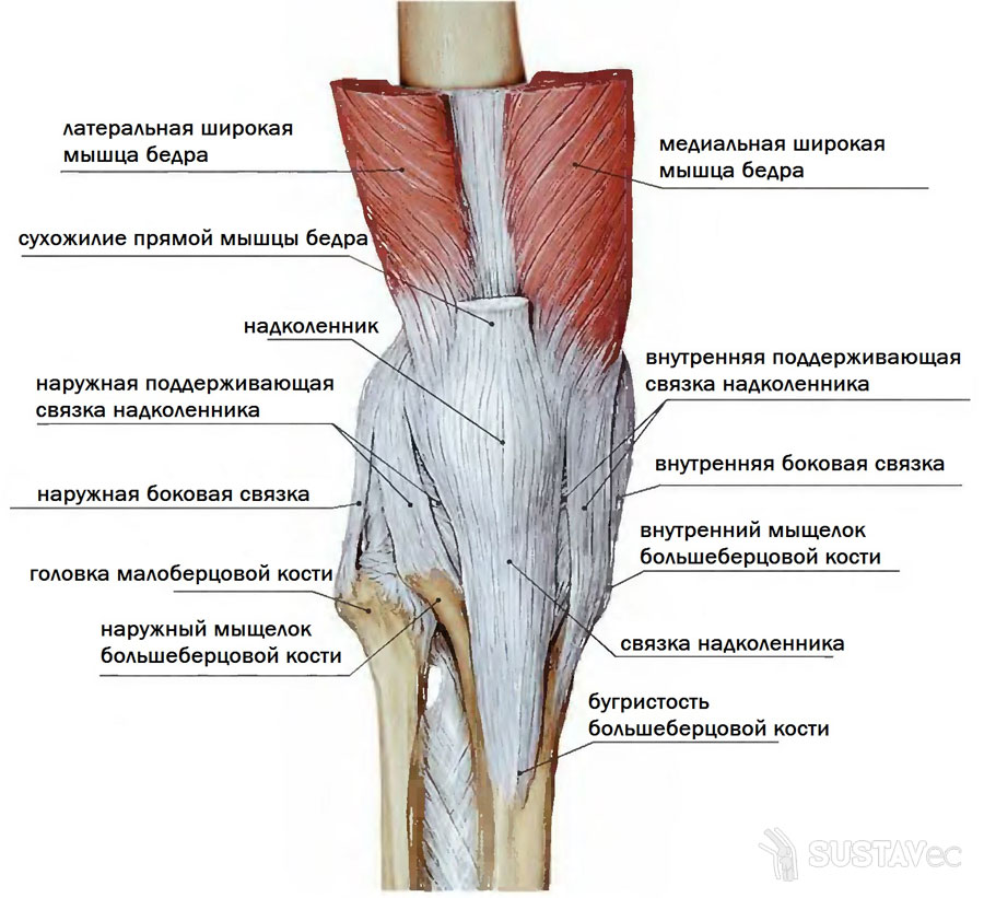 - Связка надколенника. По сути, связка надколенника это продолжение сухожилия четырехглавой мышцы бедра. Сухожилие этой мышцы подходит к надколеннику, охватывает его со всех сторон, и продолжается вниз, достигая большеберцовой кости. Некоторая часть пучков этого сухожилия, которая достигает бугристости большеберцовой кости, называется связкой надколенника.