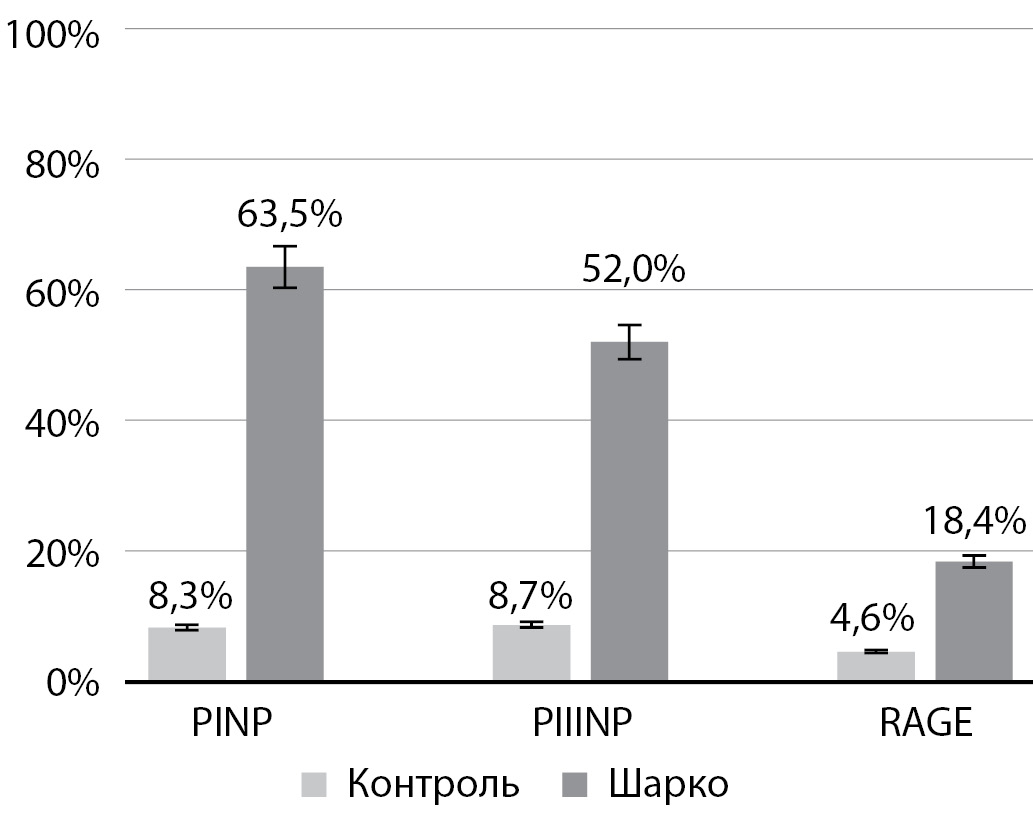 В ходе ИГХ-исследования было зафиксировано значимое увеличение относительного содержания рецепторов к PINP, PIIINP и КПГ в группе пациентов с ДНОАП по сравнению с группой контроля (p<0,05) (рис. 5).