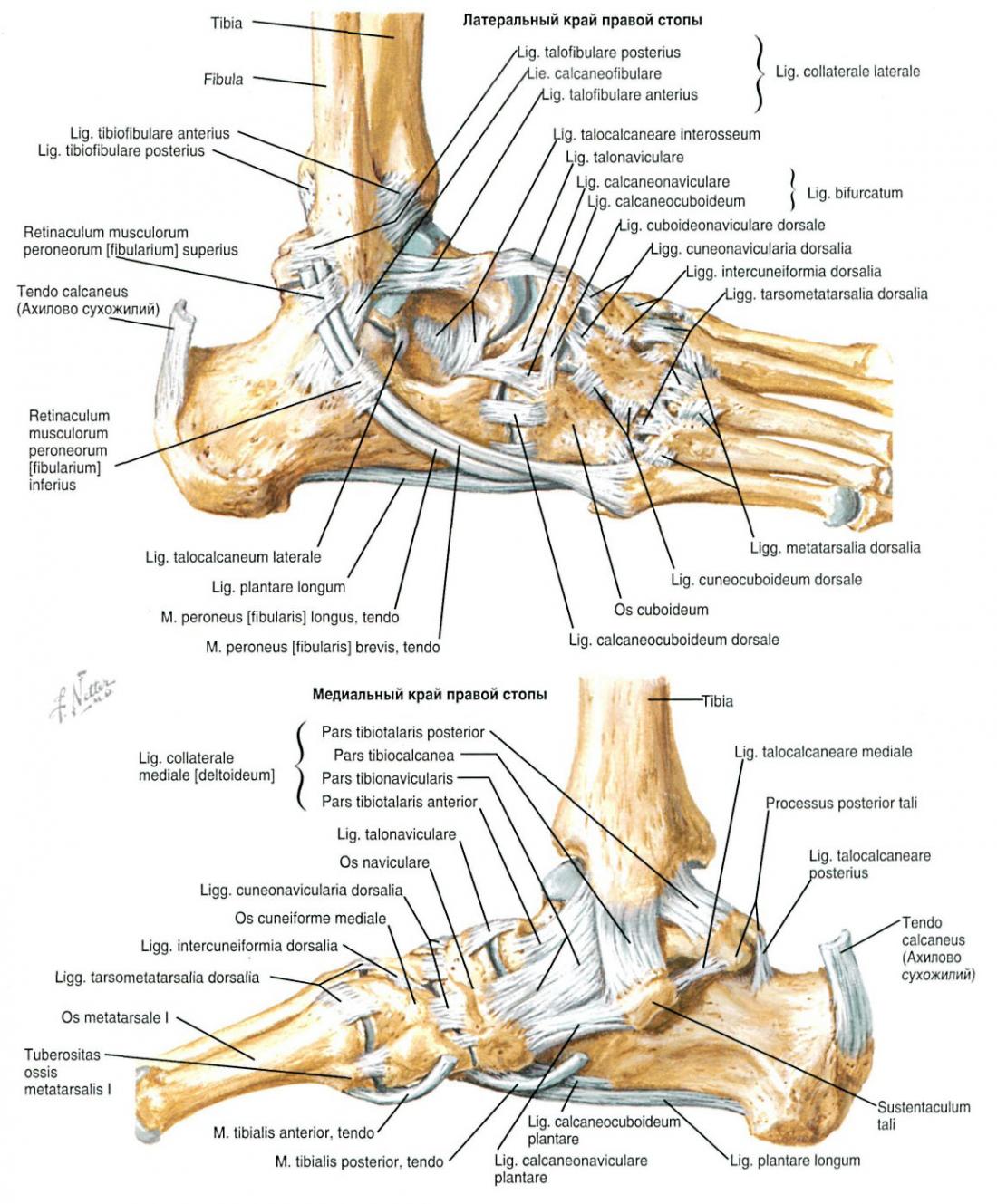 Находящаяся на внутренней сторонемедиальная (дельтовидная) связка имеет приблизительно треугольную форму и идет отмедиальнойлодыжки по направлению к ладьевидной, таранной и пяточной костям. С наружной стороны также имеются связки, идущие от малоберцовой кости к таранной и пяточной костям (передняя и задняя таранно-малоберцовые связки и пяточно-малоберцовая связка). Одной из характерных возрастных особенностей этого сустава является то, что у взрослых он имеет большую подвижность в сторону подошвенной поверхностистопы, в то время как у детей, особенно у новорожденных, — в сторону тыластопы.