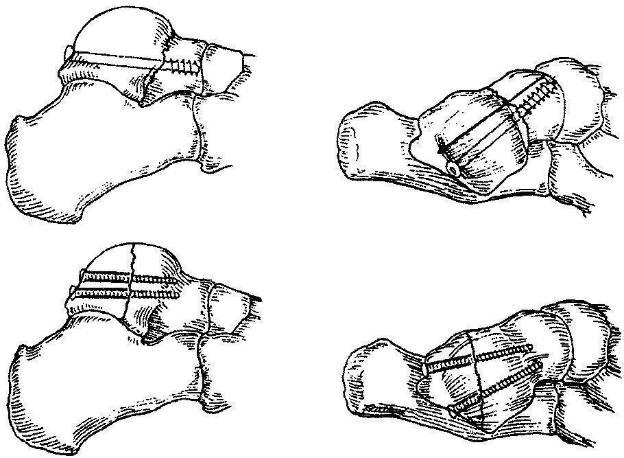 - Остеосинтез. После рассечения мягких тканей и выполнения доступа к кости отломки сопоставляются при помощи канюлированных (стягивающих) винтов 2,7-4,5 мм. Если их длины недостаточно для фиксации отломков, то применяются мини-пластины 2,4 мм с мини-винтами.
