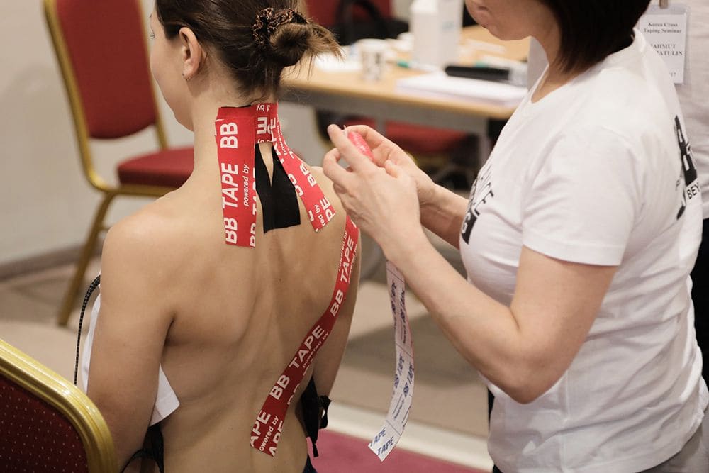 Мышцы шеи должны быть максимально растянуты. Следует более подробно ознакомиться с инструкцией. Для тейпирования понадобится 3 I-образных куска тейпа. Два отрезка ленты клеят вдоль позвоночника, третью полосу – горизонтально. Место для нее выбирают с учетом локализации максимальной болезненности. Такой метод ускоряет его обезболивание. Благодаря кинезиотейпу мышцы и суставы позвоночника будут фиксированы и защищены, при этом движения отсутствуют, но не отмечается скованность.