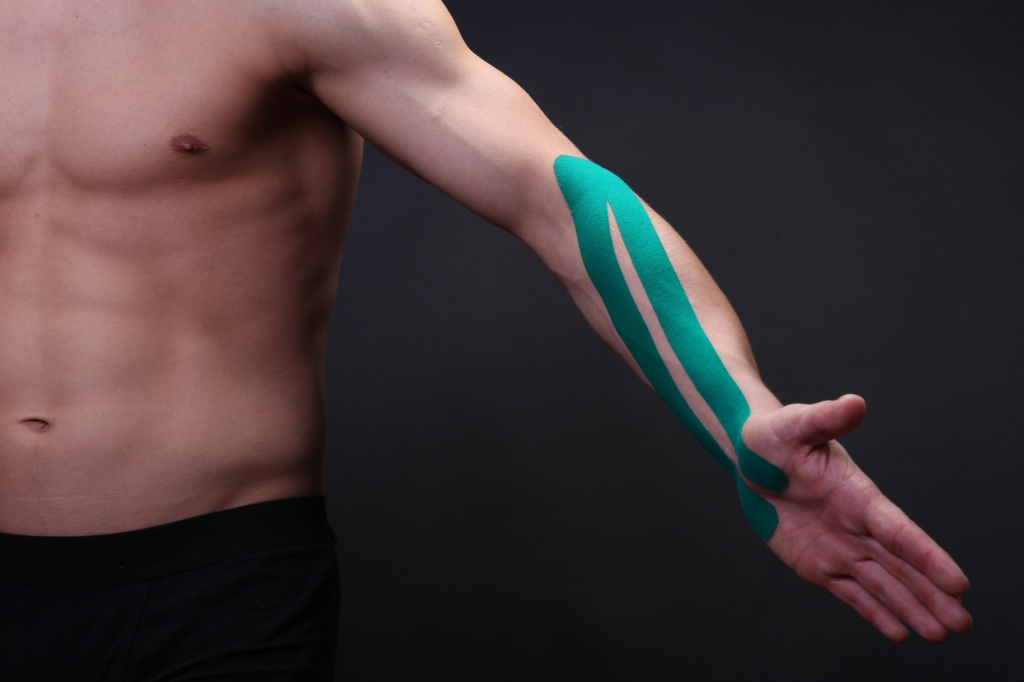 - Ленты фиксируют непрерывным наложением, первую полосу прикрепляя к основанию кисти, а затем продвигаясь к локтю. При этом тейпы должны лежать внахлёст.