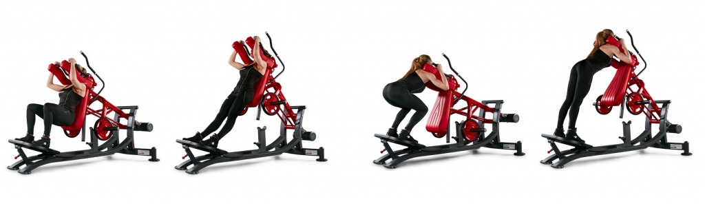 Нижние конечности выпрямляют, отклоняют корпус назад. В основном нагружается спина, ноги. Руки выпрямлены, плечи расслаблены. В завершение движения руки сгибают, вытягивают плечи. Тело слегка отклоняют, ноги выпрямляют. Рукоятку тянут к брюшным мышцам.