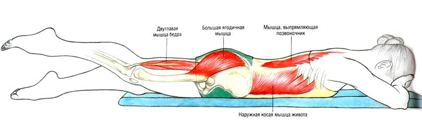 - Лежа на животе: подъем прямых ног с удержанием их на весу; поднимать голову и плечевой пояс, одновременно делая взмахи руками; изометрическое сокращение мышц тазового пояса.