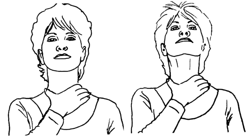 - Исходное положение пациента не меняется. Он должен сделать медленный вдох и поднять голову сперва вверх, а затем аккуратно запрокинуть ее назад. Взгляд больного должен быть устремлен в потолок. В запрокинутом состоянии нужно зафиксироваться на 3-5 секунд, а затем вернуться в начальную позу.